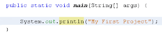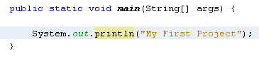 Select println( ). What this does is to print a line of text to the output screen. But you need to place your text between the round brackets of println. Your text needs to go between a pair of double quotes: