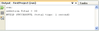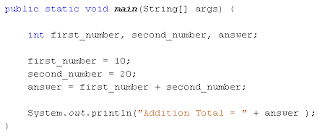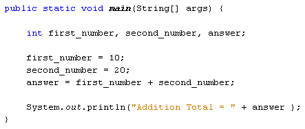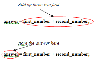 For the answer variable, we want to add the first number to the second number. Addition is done with the plus ( + ) symbol. Java will then add up the values in first_number and second_number. When it's finished it will store the total in the variable on the left of the equals sign. So instead of assigning 10 or 20 to the variable name, it will add up and then do the assigning. In case that's not clear, here's what happens: